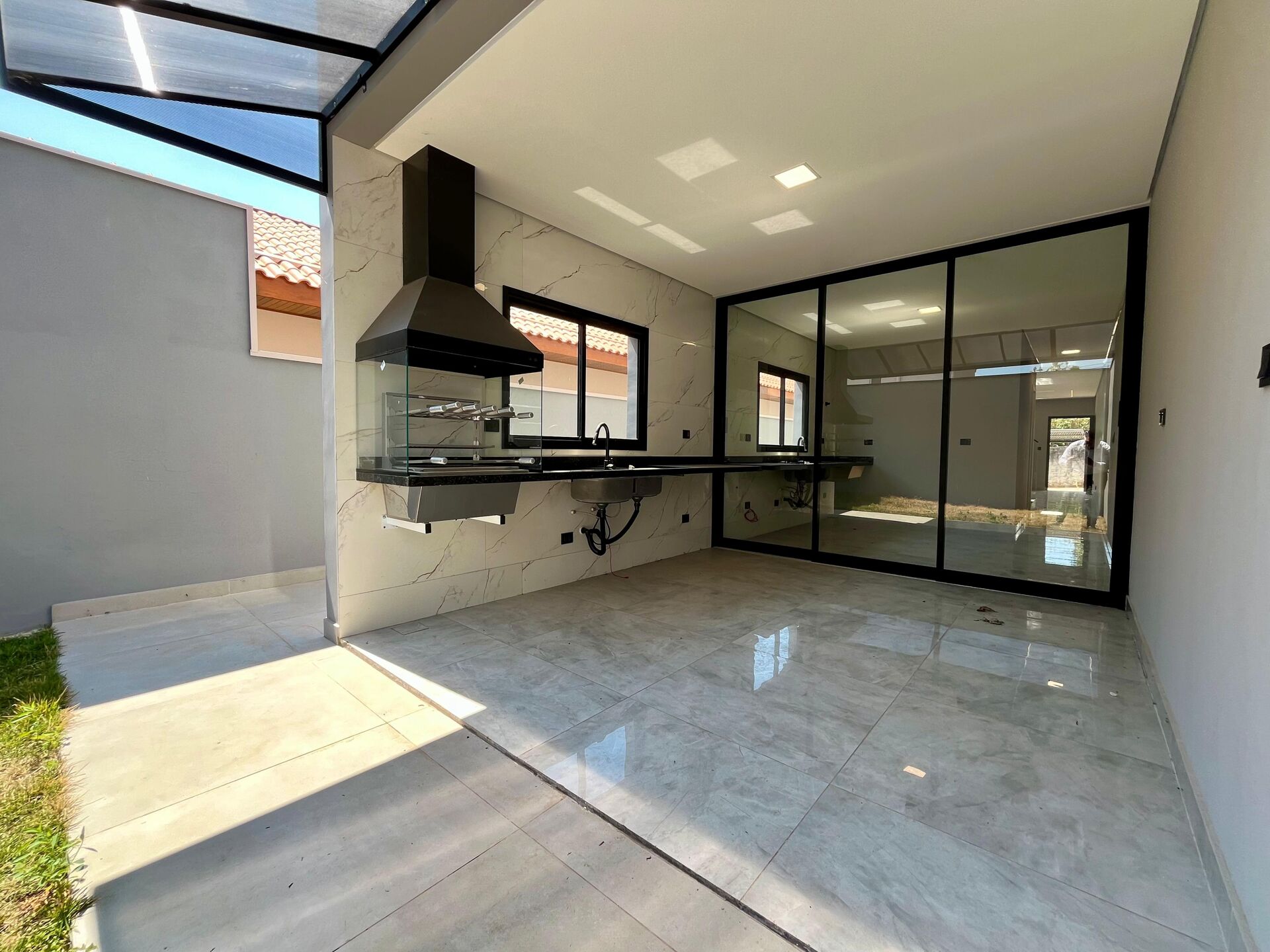 * A churrasqueira integrada com a cozinha e a esquadria até o teto são um dos espetáculos da casa.